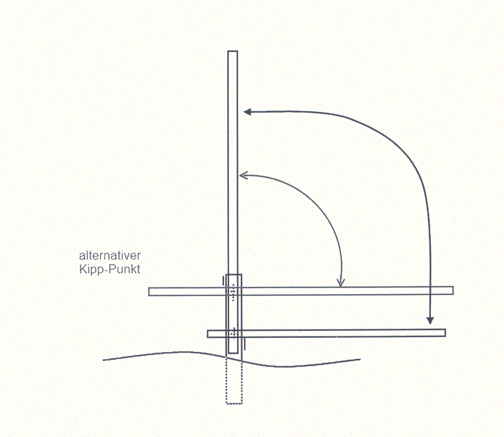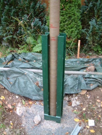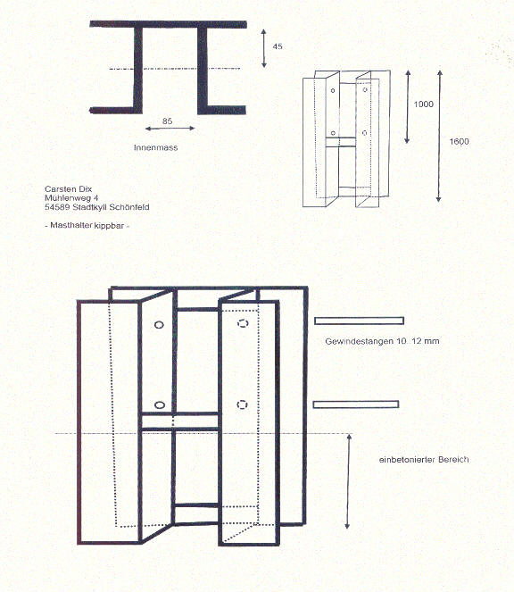 Der Mast selbst ist aus Glasfasermaterial und zweiteilig. Der Mastfuß ist relativ einfach, zwei U-Profile, paar Zentimeter Flachstahl, Gewindestangen aus Edelstahl (soll ja nicht rosten). Das Ganze noch Schweissen und mit Farbe "dekorieren" - letztendlich ein Loch mit Beton füllen und den Mast - möglichst in Waage reinstecken und dann kann es endlich losgehen.